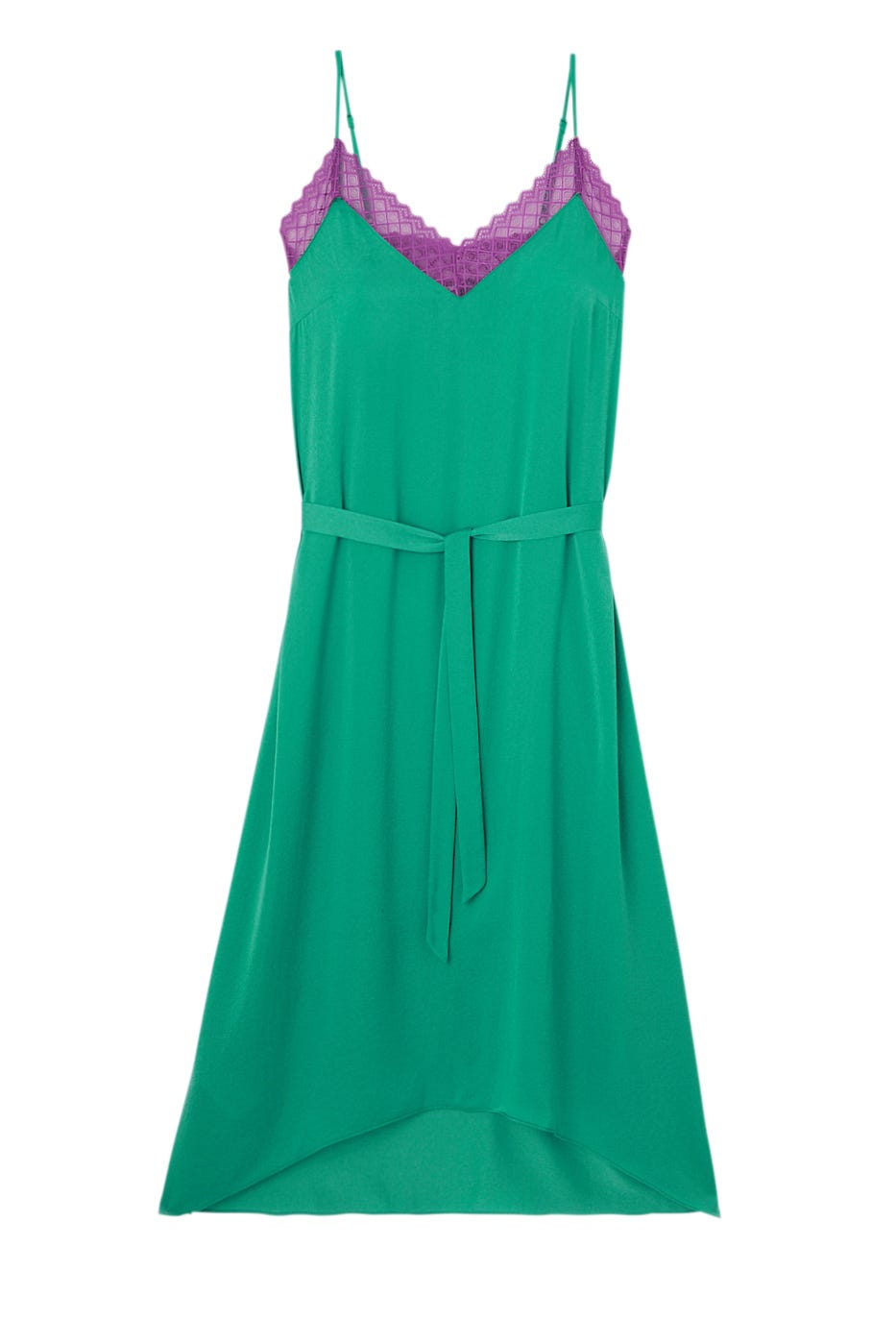 Este vestido de estilo lencero y largo midi cultiva nuestro sentido de la feminidad. Corte evasé. Tejido sedoso y suave. Encaje en el escote de pico delante y detrás. Tirantes finos (regulables). Cinturón para anudar. Bajo redondeado asimétrico. Contiene fibras recicladas.