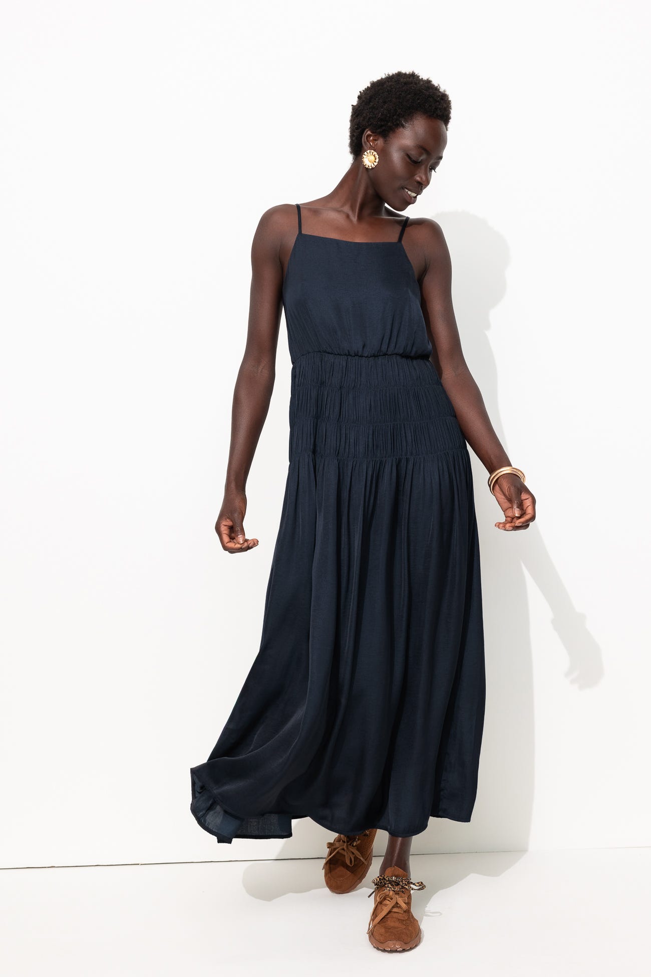 Este vestido de satén liso seduce a su paso: ¡prepárate para un éxito seguro, con deportivas, esclavas o tacones! Diseño ligeramente evasé y largo midi. Cintura con fruncido elástico. Tirantes finos regulables, cruzados y anudados en la espalda. Escote espalda. Rematado. Este vestido contiene fibras recicladas.