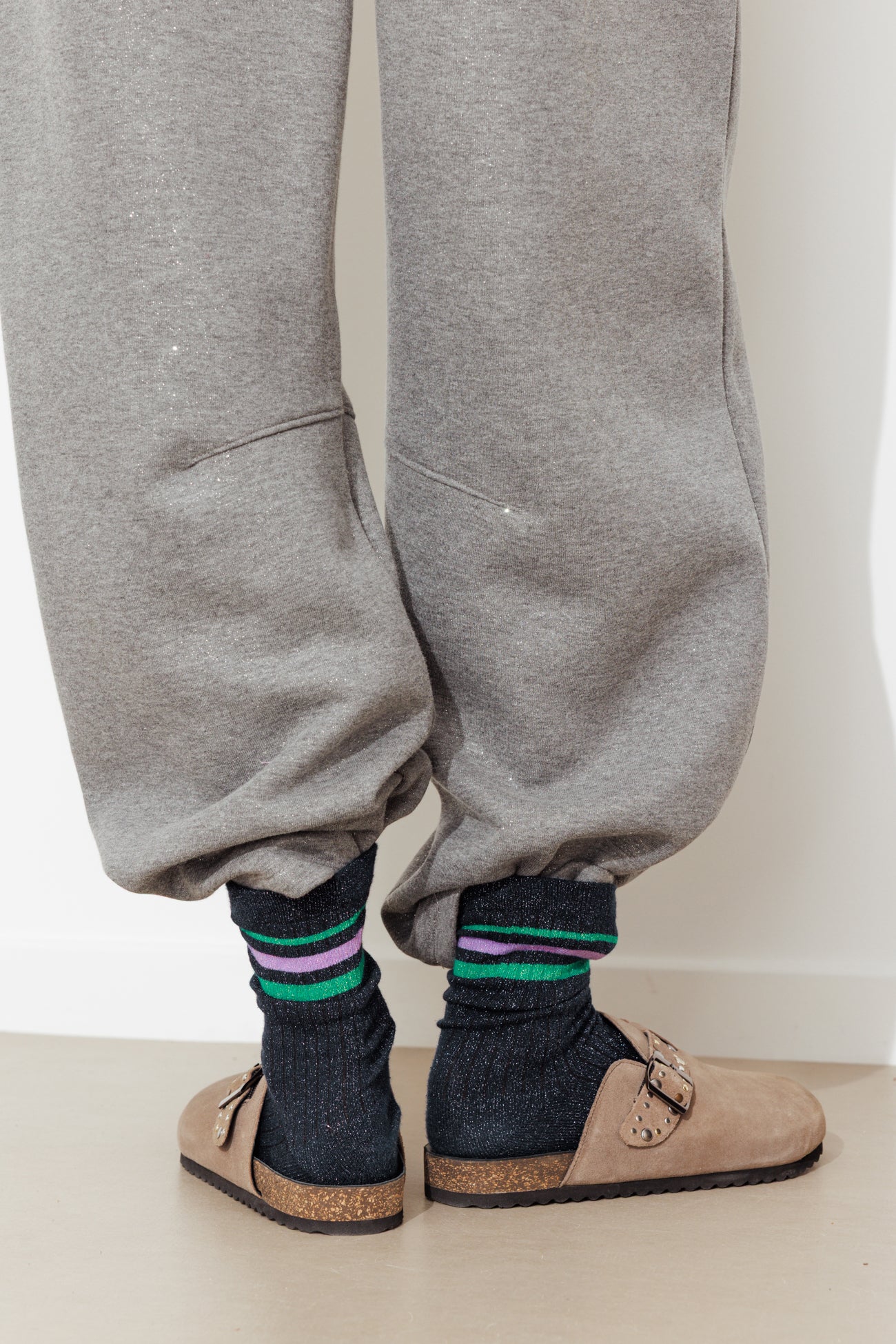 Calcetines de canalé y rayas en versión brillante: son alegres y súper trendy. Póntelos con mocasines, náuticos, derbies o botines. Punto fino y extensible con hilo metalizado. Tacón y punta marcados. Borde de canalé elástico. Bonita idea de regalo.