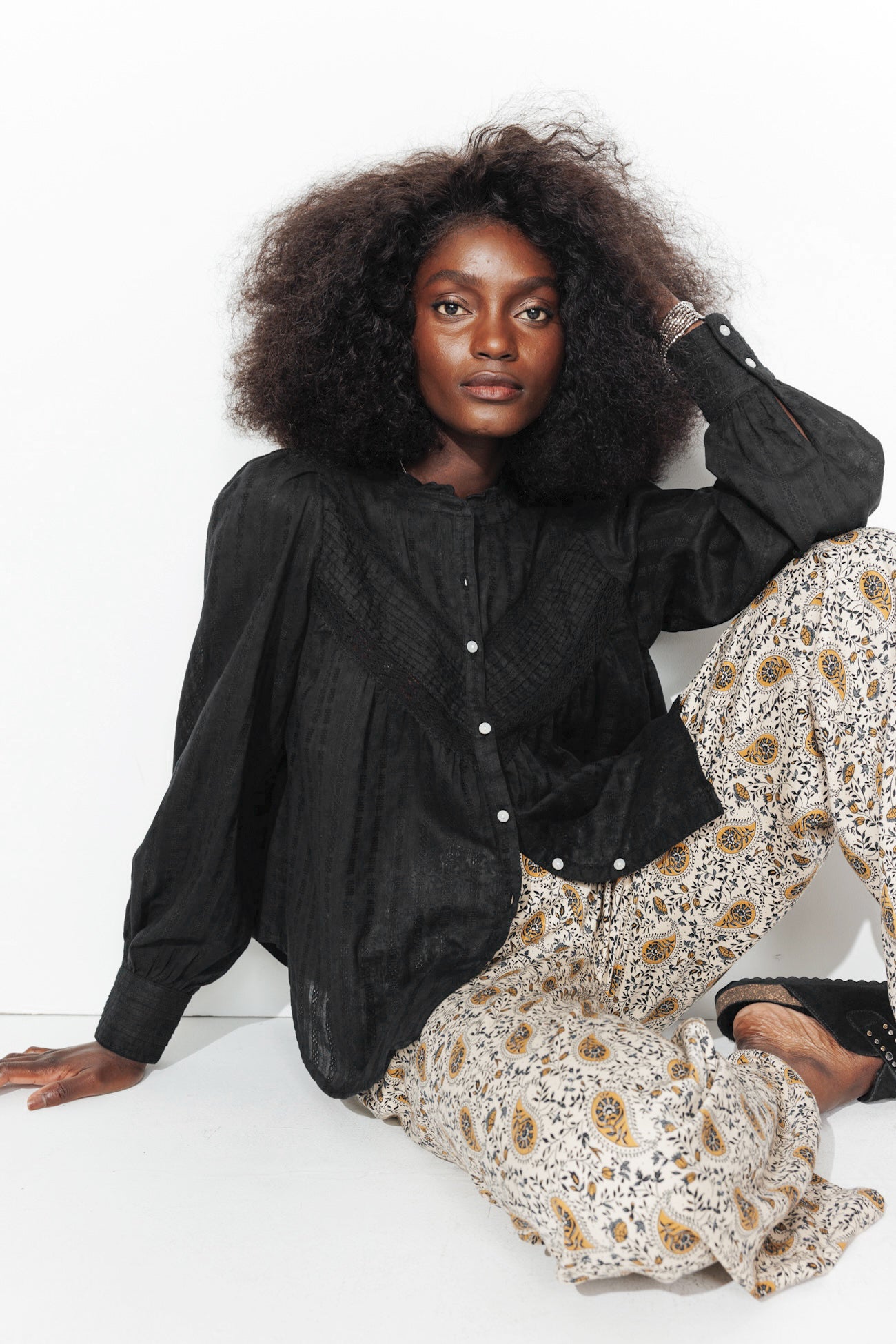 Retro y romántica. Esta camisa es una preciosidad. Fíjate en los bonitos detalles: motivos marcados, botones nacarados, frufrú, alforzas y cinta de encaje. Corte recto. Cuello redondo. Cierre con botones. Manga larca abullonada con puño abotonado. Bajo redondeado. Contiene algodón procedente de la agricultura ecológica, cultivado sin pesticidas, sin abonos químicos y sin OGM.