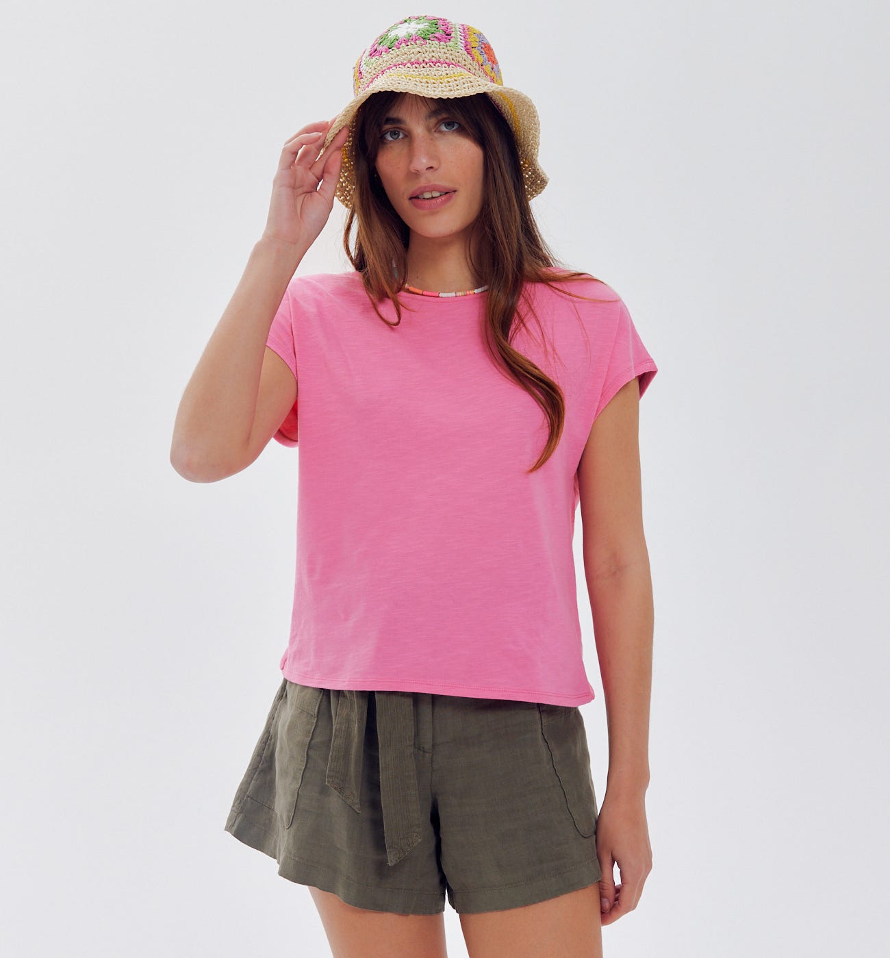 ¡Esta camiseta te va a seducir al instante! El cuello es amplio delante y de pico pronunciado en la espalda. Dos piezas drapeadas se reúnen creando un efecto nudo por detrás. Punto 100% algodón. Corte recto. Manga corta. Bajo redondeado. Costuras a tono.