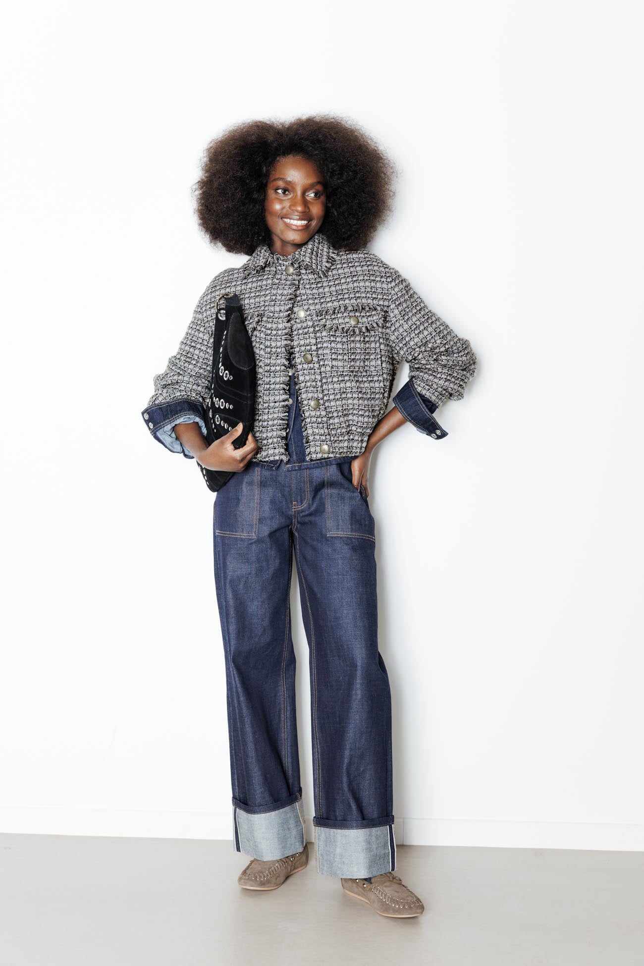 Imagen Couture, súper chic. Dos opciones: combinarla con un jean de efecto lavado para romper con las normas; o con un pantalón pitillo o una falda lápiz para una imagen chic. Tejido enriquecido con lana. Corte corto y elástico en el bajo. Cuello camisero flecos. Cierre botones flecos. 2 bolsillos pecho. Botones metálicos grandes. Manga larga, puño elástico. Forro: Contiene fibras recicladas.