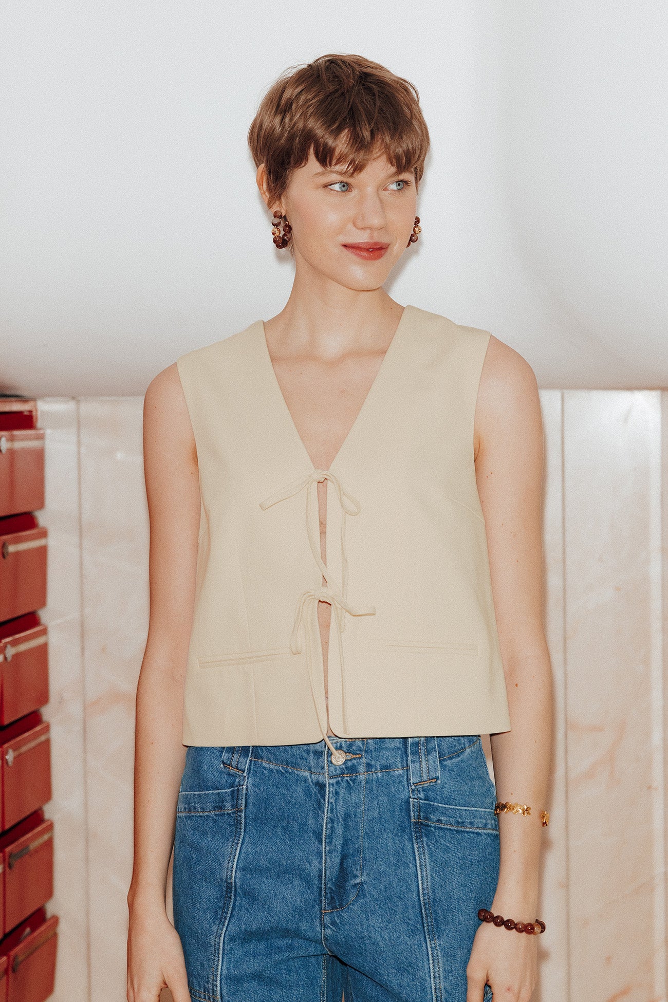 Inspirado en el vestuario masculino, este chaleco sastre tiene un detalle de lazadas que feminiza la imagen. Póntelo con los brazos al descubierto y añade algunas joyas. Es perfecto para una ocasión especial. También queda muy bonito con un jean de efecto lavado. Corte ceñido. Escote de pico delante. Pinzas pecho. Sisa americana. 2 bolsillos falsos. Bajo recto. Forro. Esta pieza de mujer contiene fibras recicladas.