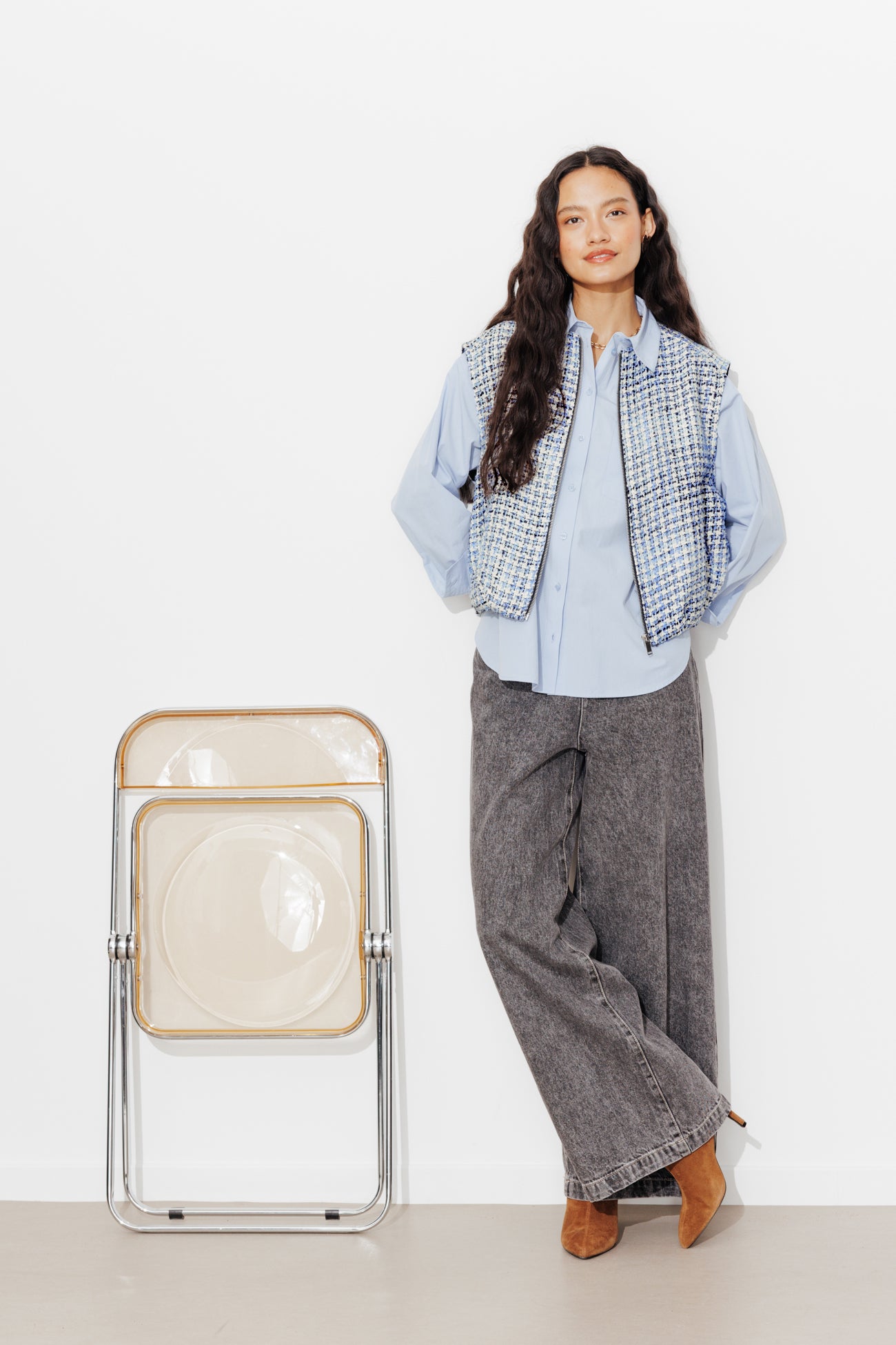 Pequeño evento de la Colección. ¡No te quedes sin él! Este chaleco combina dos tendencias atemporales: el espíritu Couture del tweed ligeramente brillante y el estilo sportswear del cierre con cremallera frontal. ¡Un éxito garantizado! Diseño chaleco con juego de pliegues en parte inferior. Cuello redondo. 2 bolsillos delante. Sisa americana. Bajo recto. Forro satinado. Este chaleco de mujer contiene fibras recicladas.