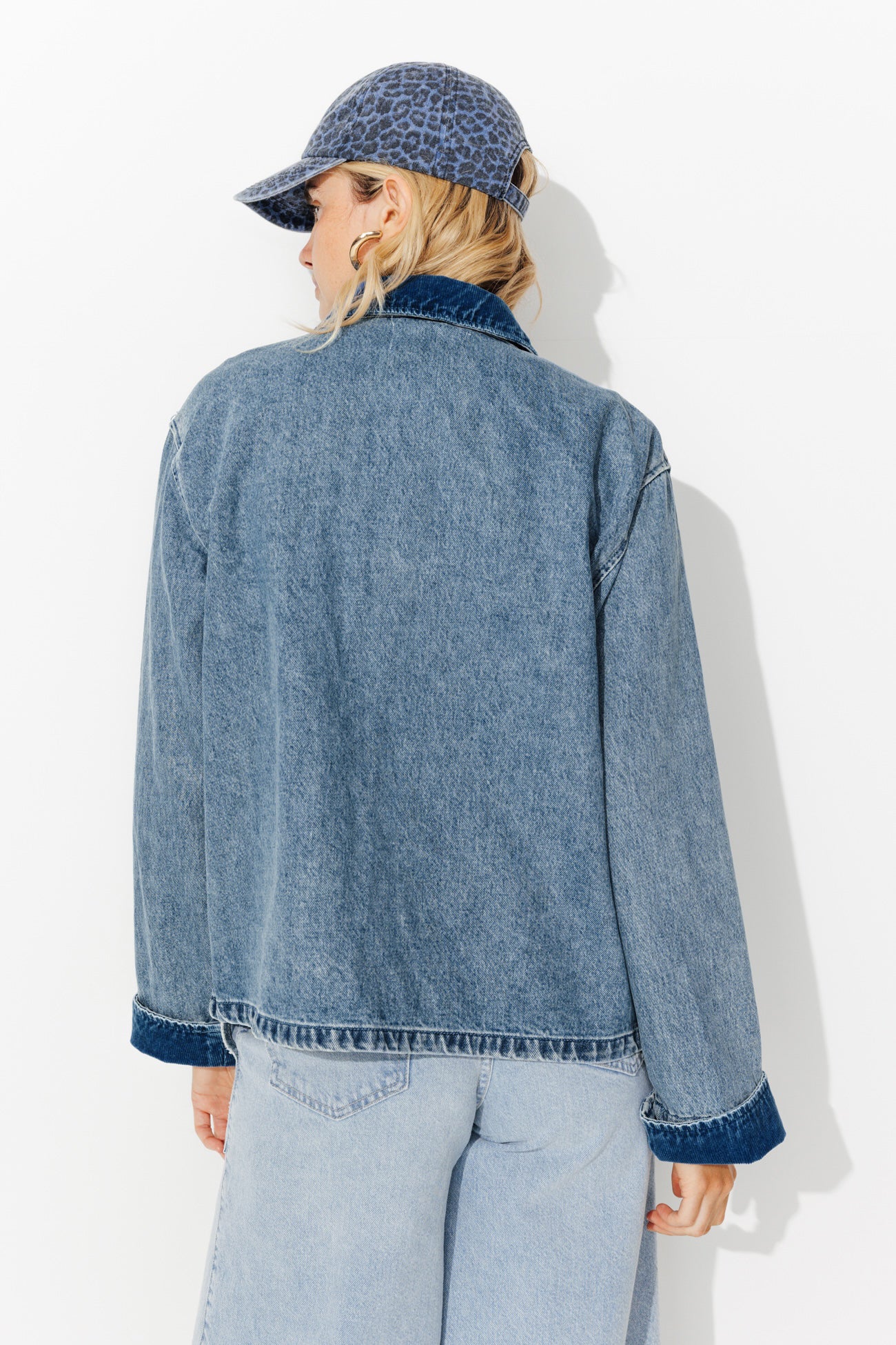 Imagen andrógena & estilo workwear. Esta chaqueta vaquera es la nueva estrella de la temporada gracias a su cuello con solapa y sus puños de pana. Queda especialmente bien con un vestido o una falda larga. Denim 100% algodón. Corte recto. Cierre cremallera oculta bajo tapeta con botones a presión. 2 bolsillos de plastrón con solapa. Manga larga con vuelta ajustable. Bajo recto. Pespuntes.