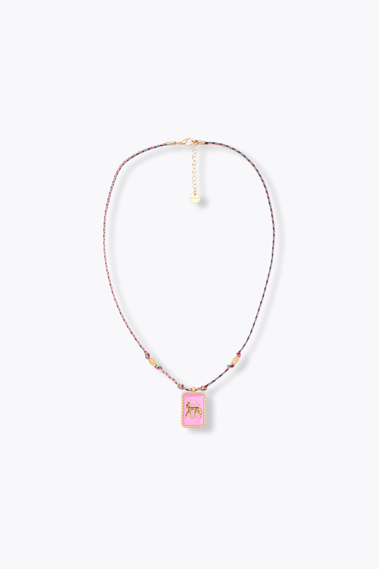 Avisamos a las fans del leopardo: os va encantar llevar este collar para completar vuestros looks de primavera-verano. Colgante rectangular con un leopardo. Cordones trenzados brillantes, cuentas. Cierre y cadenilla de metal, largo regulable. Ideal para darte un pequeño capricho o para regalar.