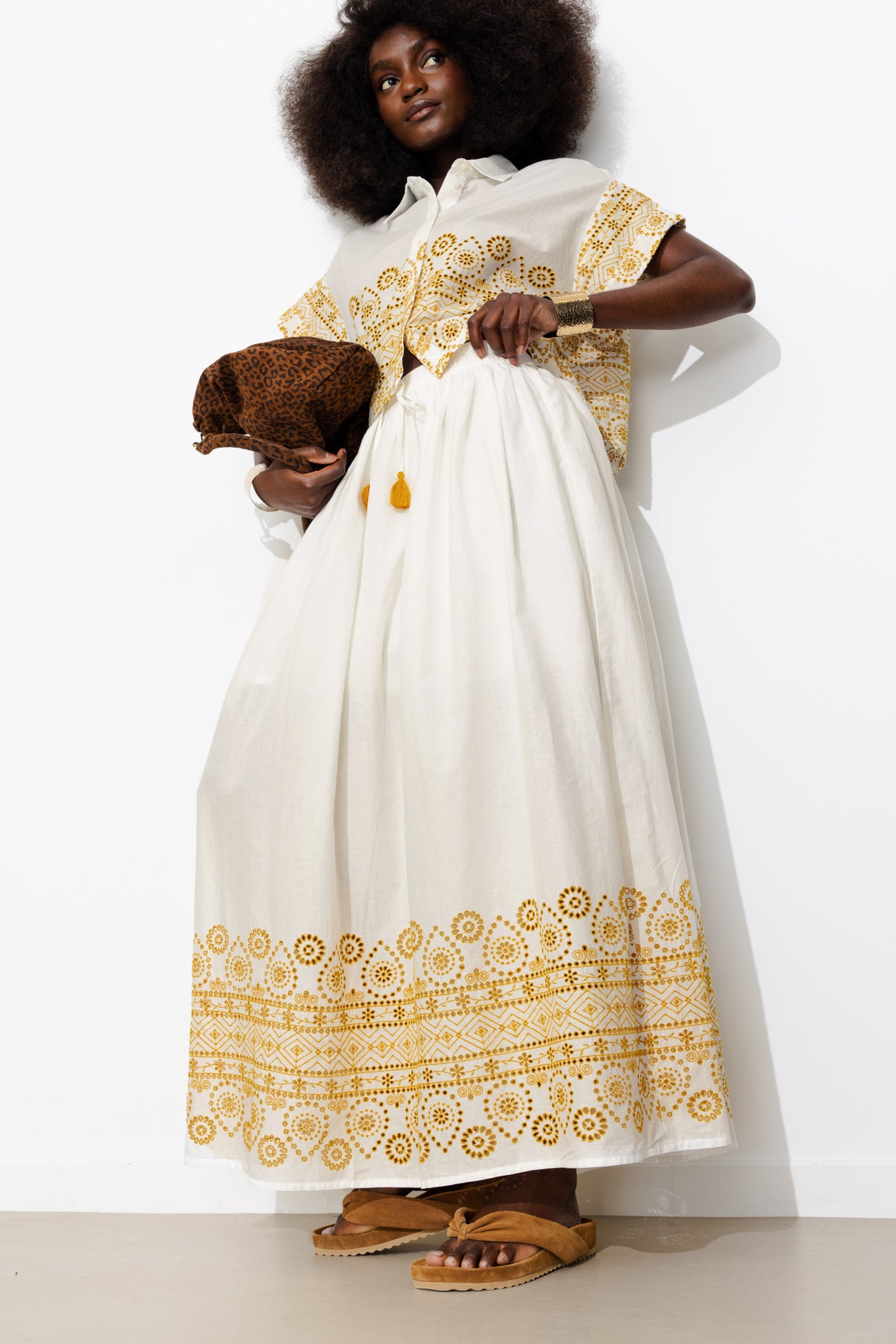 Estilo folk e imagen desenfadada. Esta falda de algodón presenta bonitos bordados calados y coloridos: ¡es una preciosidad! Póntela con sandalias, zuecos o esclavas. Combínala con un top a juego y un sombrero de paja, por ejemplo. Algodón suave y ligero. Forro de gasa de algodón más corto que la falda. Cintura elástica con cordones con borlas para anudar. Corte acampanado. Bajo ligeramente redondeado. Rematado a tono.