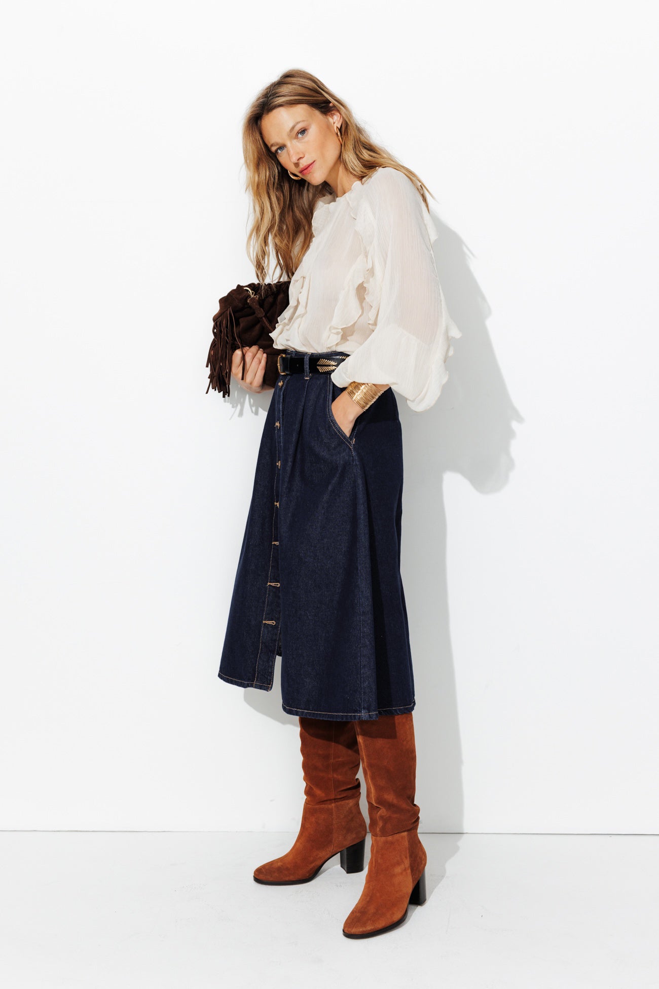 ¡Esta falda vaquera ha sido aprobada por unanimidad! ¡Es una verdadera joya de estilo! Tiene mucha presencia… para avanzar con una feminidad evidente. Denim 100% algodón. Corte evasé, largo midi. Pinzas delanteras. Cintura alta con trabillas. Abertura totalmente abotonada delante. 2 bolsillos italianos. Bajo redondeado. Costuras a contraste. Esta falda contiene algodón reciclado.