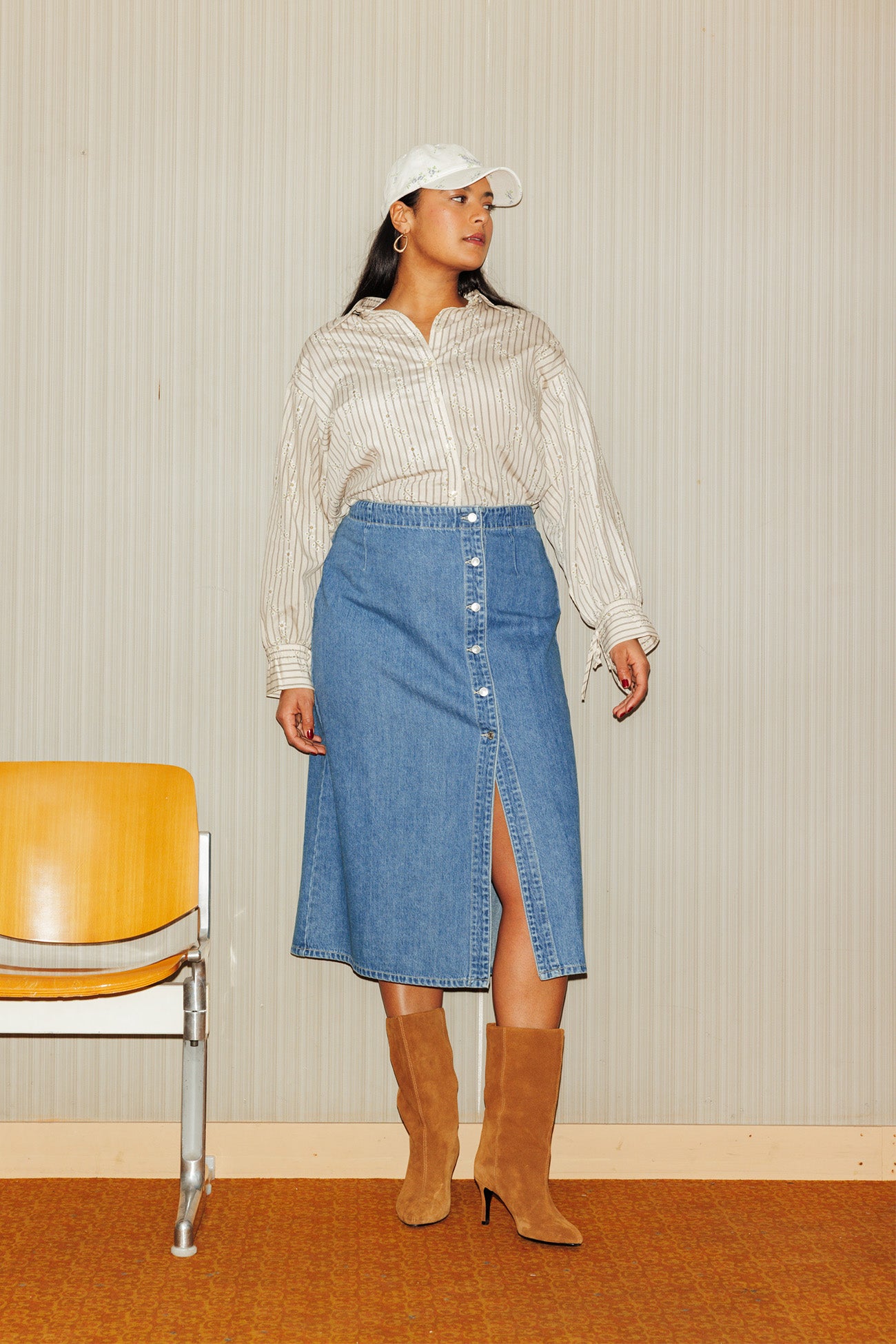 La falda vaquera de largo midi es un pieza que conocemos, nos gusta y valoramos. Aquí te presentamos una nueva versión con botonadura asimétrica: le da una bonita estructura al look, eleva el estilo a otro nivel, especialmente con la abertura delante. Te gustará durante todo el año. Denim 100% algodón. Corte lápiz. Cierre con botones tachuela. Costuras a contraste. Esta falda de mujer contiene algodón reciclado.