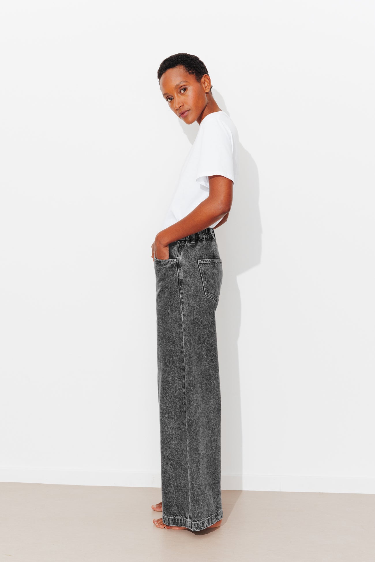 Damos la bienvenida al nuevo jean CESAR, muy ancho y de tiro alto. Este jean llega dispuesto a convertirse en tu compañero de moda ideal. Si necesitas una razón más para comprarlo: fíjate en la cintura elástica en la espalda. Denim 100% algodón. Pernera muy ancha y larga. Trabillas. Cierre botón tachuela y cremallera metálica. 5 bolsillos. Este jean de mujer contiene algodón reciclado.