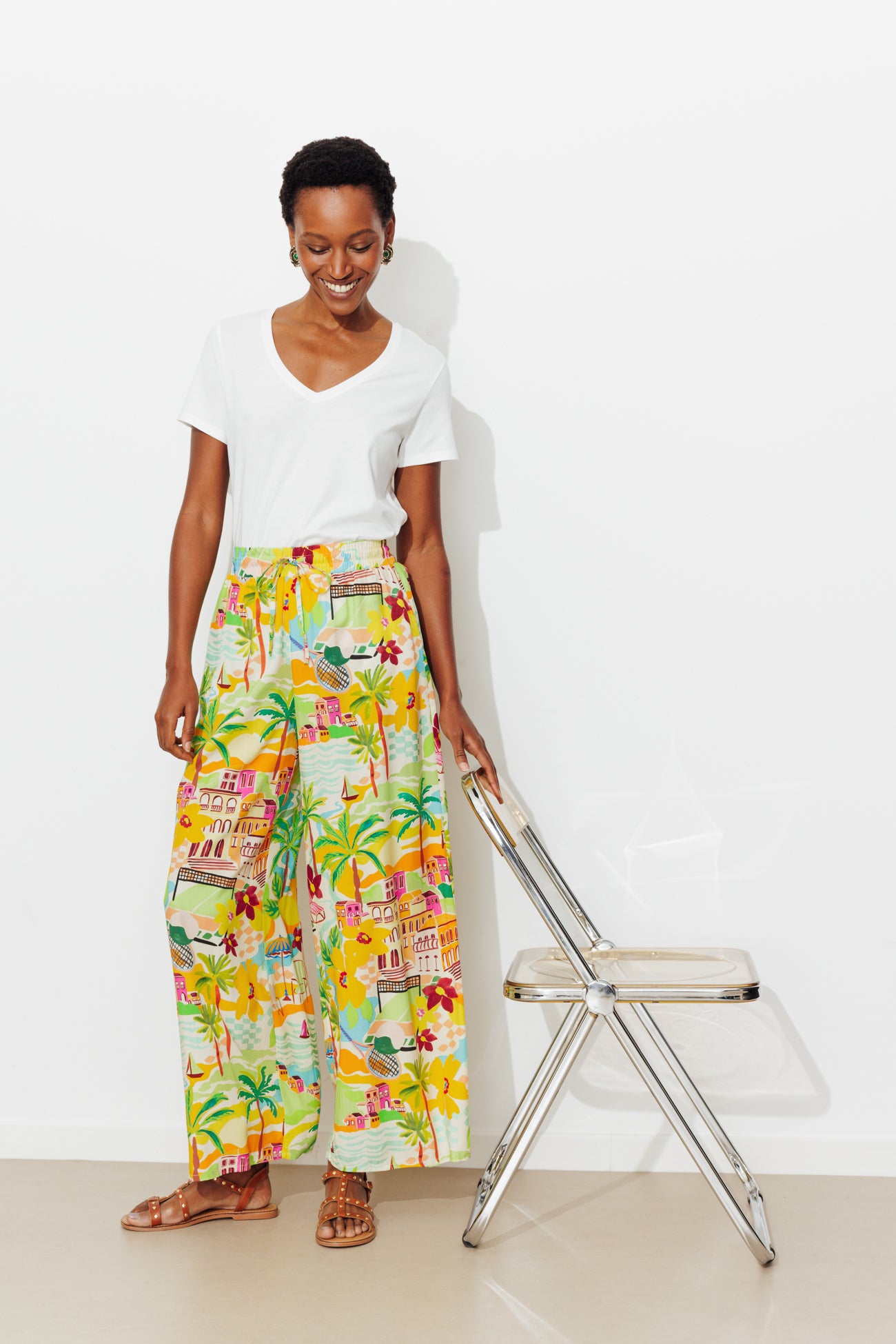 Vitalidad e imagen cool. Este pantalón colorido es fresco, original y muy alegre. Nos gusta su diseño ancho y corto para una imagen libre y dinámica. Tejido suave y fluido. Cintura alta con fruncido elástico y detalle de cordones para anudar. 2 bolsillos ocultos en las costuras laterales. Rematado. 100% viscosa ecorresponsable.