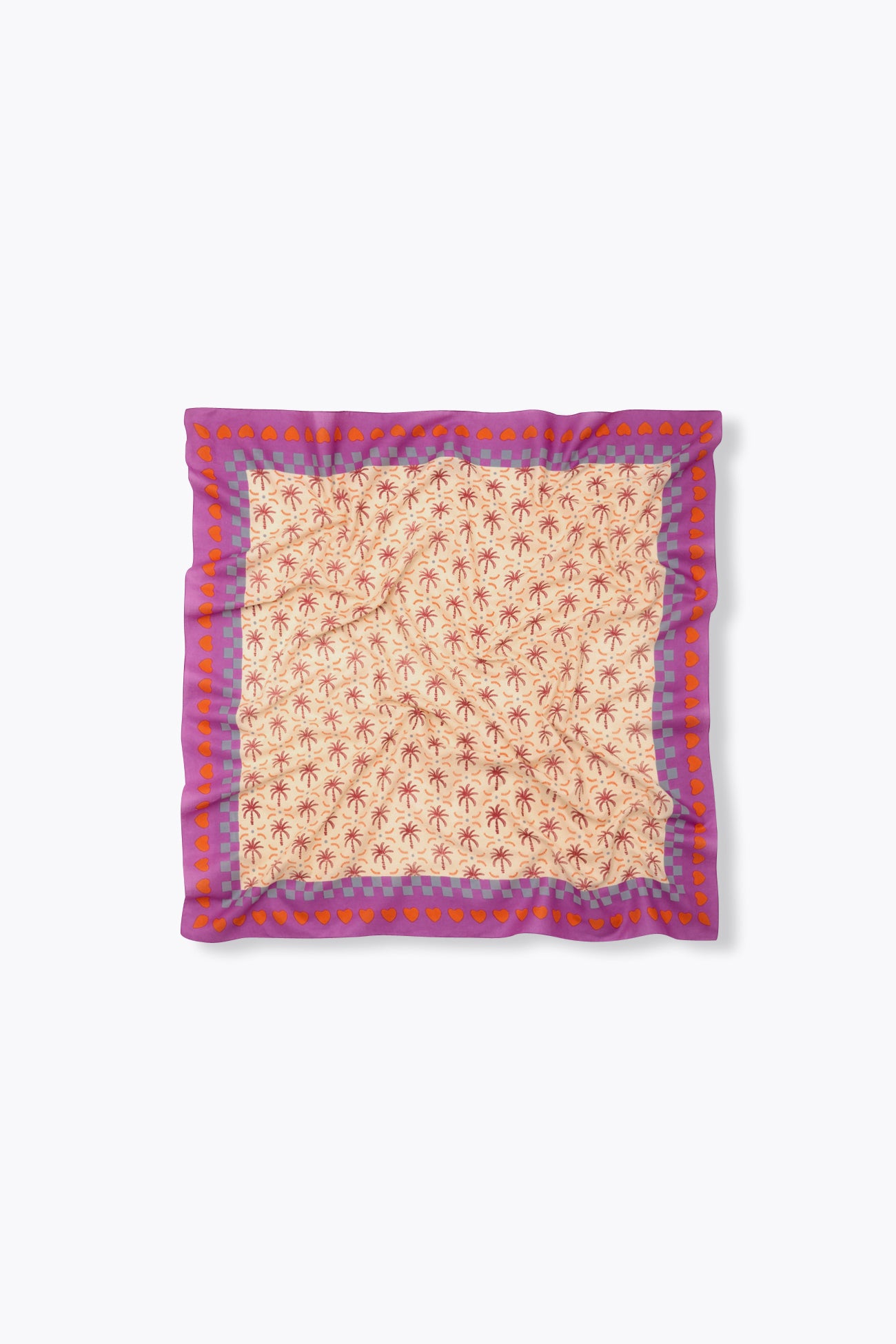 Esta temporada, llevamos el pañuelo 100% algodón de distintas formas: alrededor del cuello sin sorpresa, anudado a la cintura en forma de triángulo, sobre el cabello a modo de turbante o en el asa de un bolso. Este modelo nos seduce con sus motivos originales y coloridos: corazones y palmeras. Talla única. Rematado. Bonita idea de regalo. Este pañuelo de mujer está confeccionado al 100% con algodón procedente de la agricultura ecológica, cultivado sin pesticidas, abonos químicos ni OGM para preservar la biodiversidad.