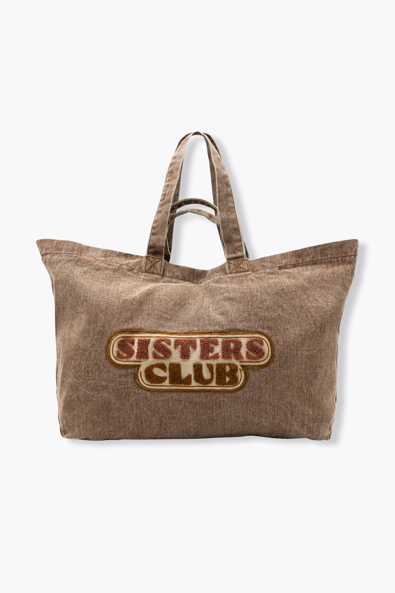 ¡Para todas las Sisters! Esta tote bag grande es un homenaje a la sororidad y a la tendencia denim. Es una pieza esencial en la ciudad, la playa, para ir a hacer deporte, viajar... ¡Te seguirá a todas partes! Tejido en sarga de algodón, sólido y flexible. 2 asas para llevar en la mano o el hombro. 1 botón a presión. Parche Sisters Club de rizo en un lado. 1 bolsillo interior con cremallera.