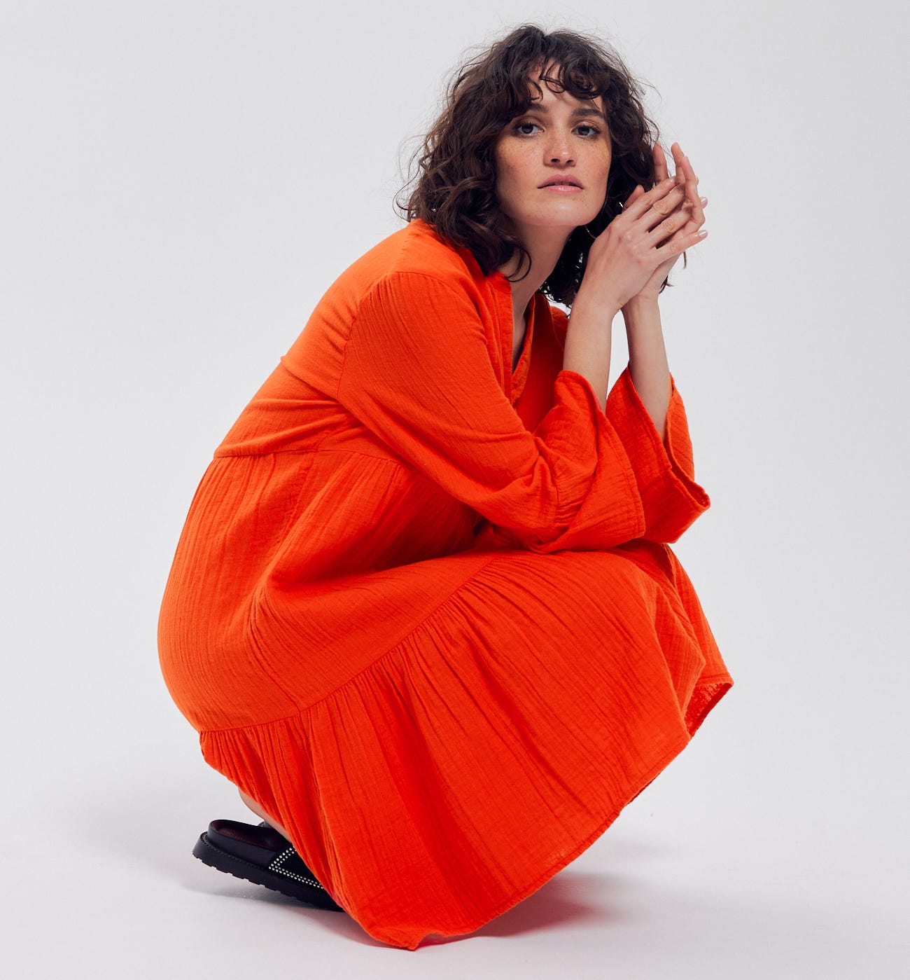 Este vestido evasé y con volante encuentra fácilmente su sitio en cualquier parte. Completamos el look con accesorios y nos vamos a recorrer la ciudad, dar un paseo por la playa, asistir a una fiesta en el jardín... Está confeccionado con gasa de algodón. Cuello mao con botones. Marcado bajo el pecho. Mangas 3/4 con volante. Costuras a tono.