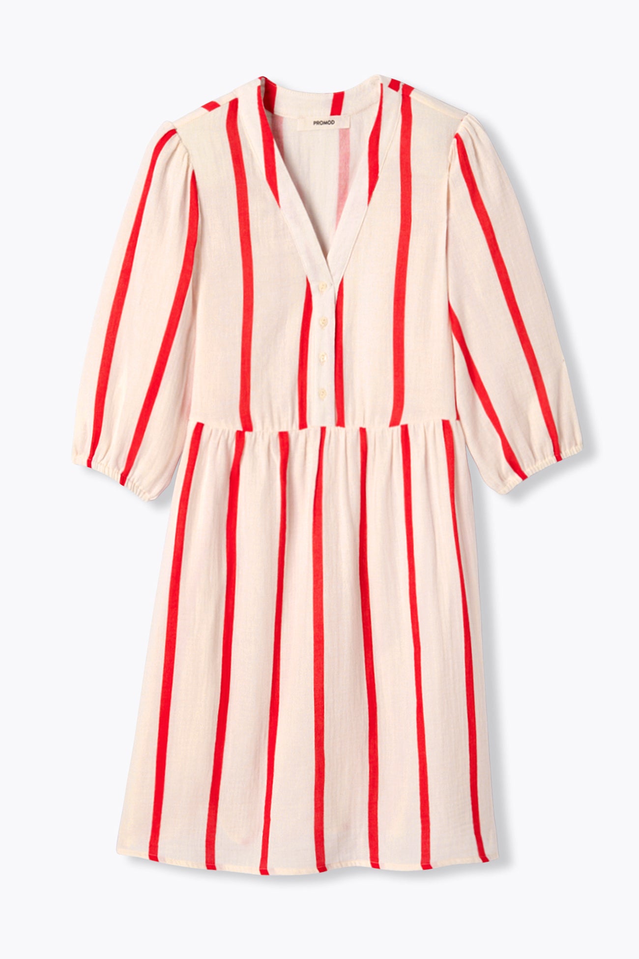 Casual. Veraniego. Y alegre. Nos encanta la idea de llevar este vestido corto de gasa de algodón. Para lucir una imagen llena de vitalidad o para disfrutar estilosa de las vacaciones, ¡es una idea excelente! No olvides tus gafas de sol para rematar tu look veraniego. Corte evasé. Escote de pico, semiabertura con botones. Manga globo al codo con elástico. Cintura alta fruncida. Bajo ligeramente redondeado. Rematado. Este vestido de mujer contiene algodón procedente de la agricultura ecológica, cultivado sin pesticidas, abonos químicos ni OGM para preservar la biodiversidad.