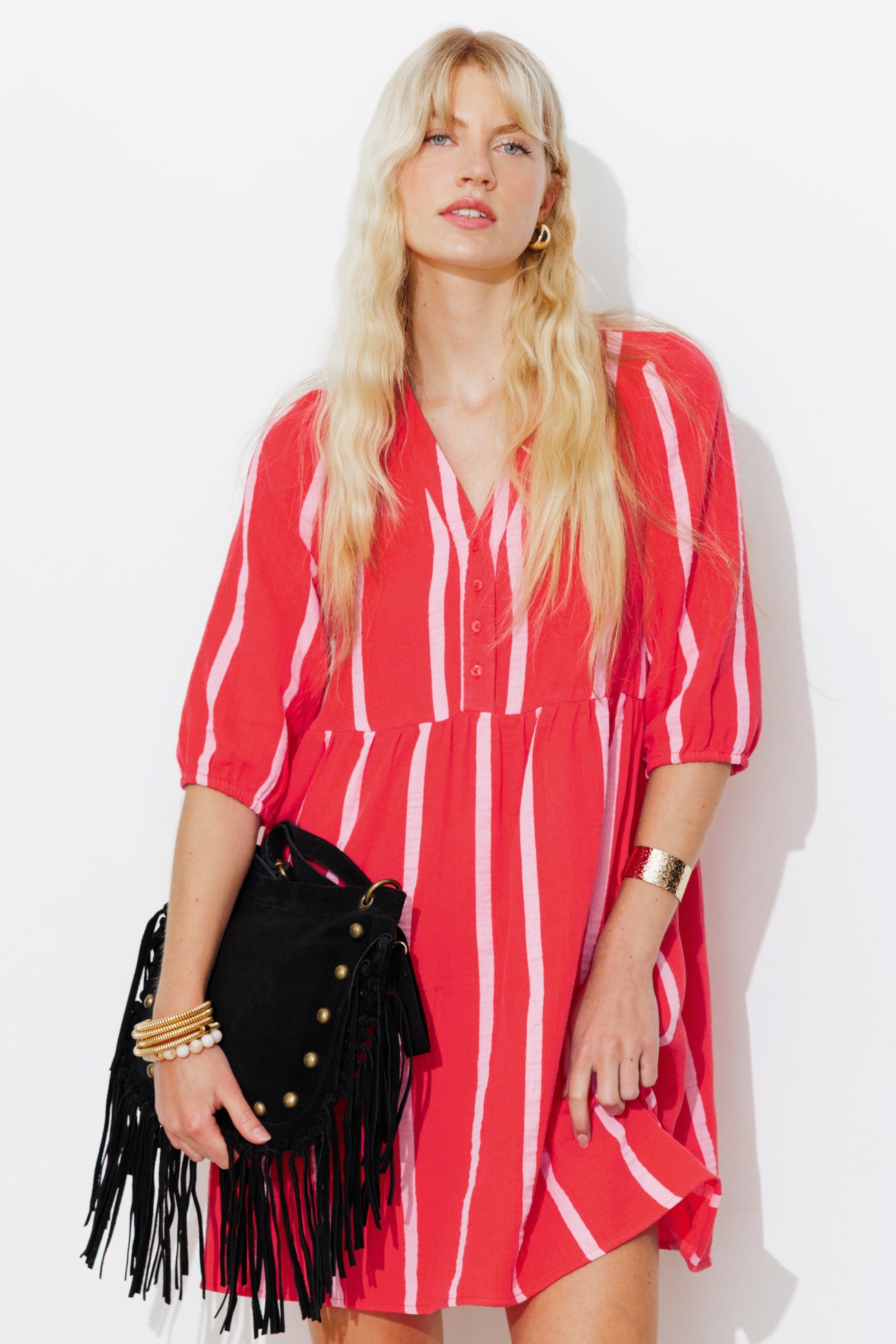 Casual. Veraniego. Y alegre. Nos encanta la idea de llevar este vestido corto de gasa de algodón. Para lucir una imagen llena de vitalidad o para disfrutar estilosa de las vacaciones, ¡es una idea excelente! No olvides tus gafas de sol para rematar tu look veraniego. Corte evasé. Escote de pico, semiabertura con botones. Manga globo al codo con elástico. Cintura alta fruncida. Bajo ligeramente redondeado. Rematado. Este vestido de mujer contiene algodón procedente de la agricultura ecológica, cultivado sin pesticidas, abonos químicos ni OGM para preservar la biodiversidad.