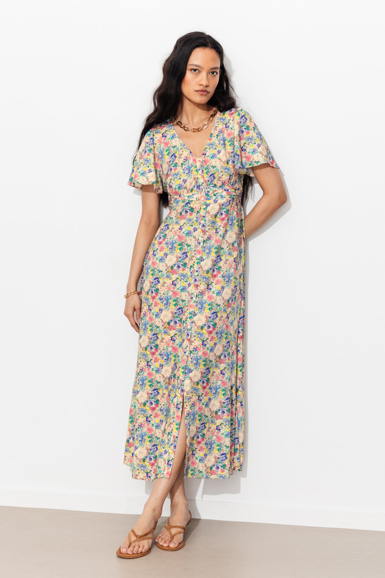 ¡Una joya de la temporada! Este vestido largo es como un jardín inglés en primavera: ¡bonito, fresco y poético! Lo elegimos para lucir looks femeninos en la primavera-verano. Añadimos un sombrero o unas gafas de sol para completar el look. Tejido suave y fluido de viscosa estampada. Corte corto y evasé bajo la cintura alta marcada con pliegues planos horizontales. Busto ceñido. Cierre totalmente abotonado. Manga corta mariposa. Rematado. Este vestido de mujer está confeccionado al 100% con viscosa procedente de la pulpa de madera de bosques gestionados de forma sostenible.