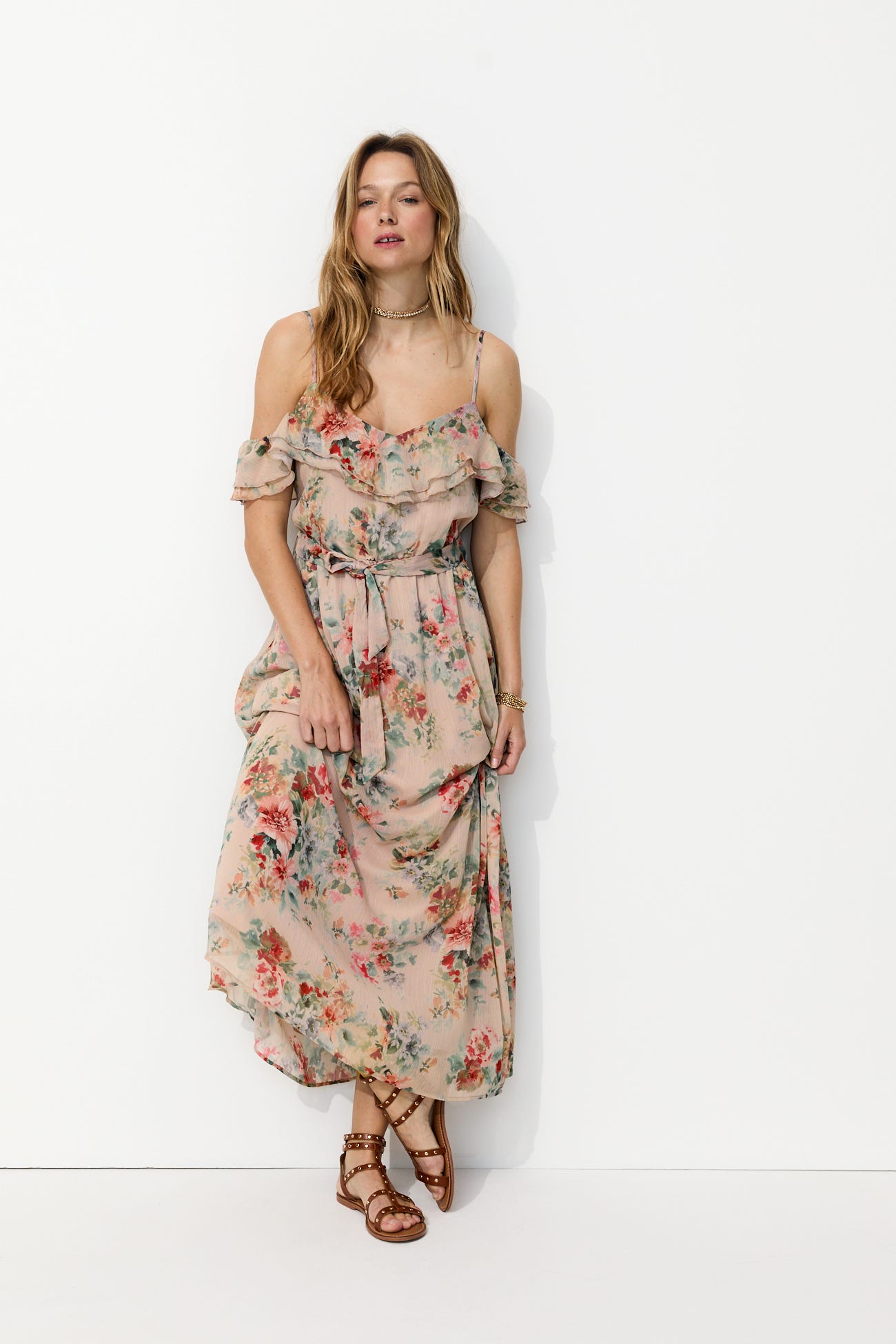 Largo. Vaporoso. Fluido. Este vestido estampado cultiva el estilo retro con sus volantes sobre el escote bardot. No olvides añadir joyas y otros accesios. Muselina crepé. Tirantes regulables. Corte evasé bajo el talle alto elástico. Cinturón lazo para anudar (de quita y pon). Rematado punto zigzag. Forro. Con rematado. Contiene fibras recicladas.