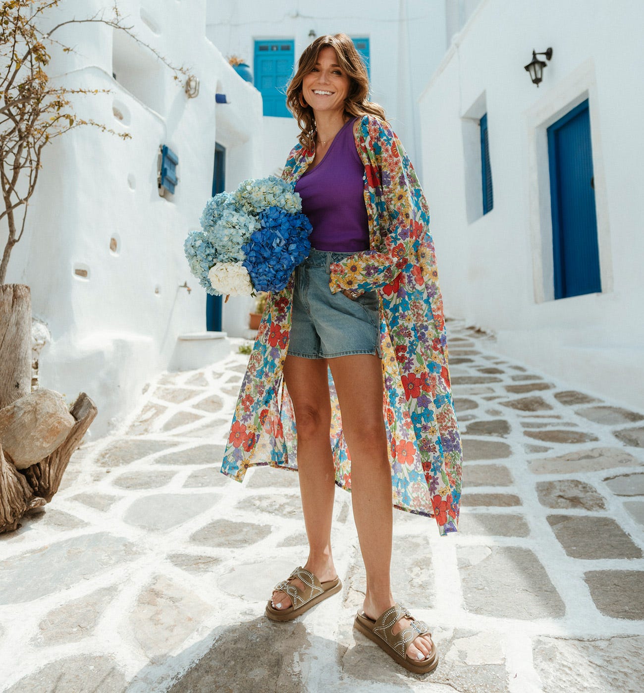 Vestido-túnica en gasa de algodón. En primavera quedará estupendo abierto sobre un look cool. En verano lo llevamos cerrado y con un cinturón para marcar el talle. También podemos ponérnoslo sobre un bikini para ir y volver de la playa. Corte amplio. Cuello redondo. Cierre con botones (nacarados). Manga larga con tira para remangar. Aberturas laterales.